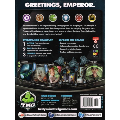 Eminent Domain is an empire building game in which your empire's abilities are based on a deck of role cards. At the beginning of the game each player has the same deck of cards, with just 2 cards for each role in it. Every turn you must choose a role to execute (your opponents will get a chance to follow suit) and in doing so you will add one of those role cards to your deck. When executing a role, you can boost its effect by playing cards out of your hand matching the role you have chosen. So for example, the more you research, the better you get at researching (because you'll have more research cards in your deck).